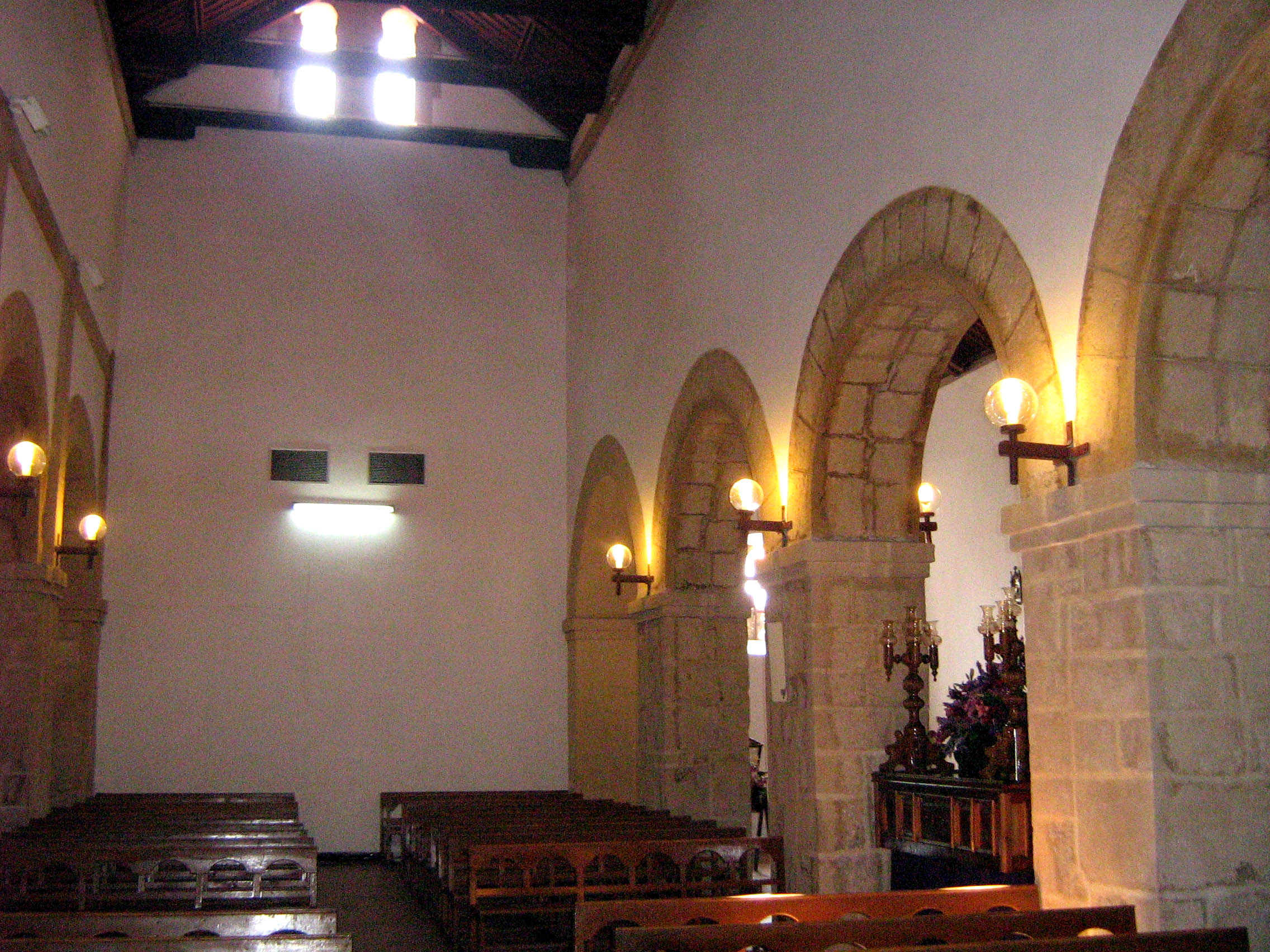 En el interior del templo, las naves se separan por gruesos pilares cuadrangulares que sujetan arcos de medio punto con alfiz. El arco de triunfo es de medio punto con trasdós lobulado.