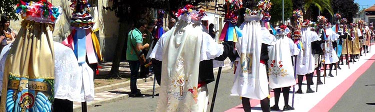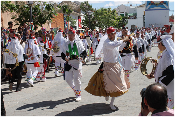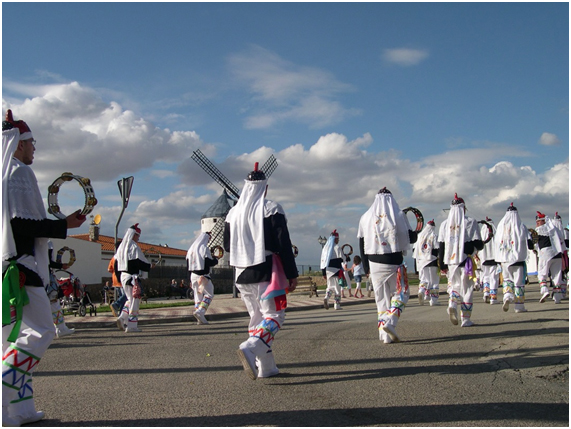Grupo de danzantes por las calles del pueblo y molino “La Unión” al fondo. Foto: http://turismoestoledo.com/descubrelo/recurso?content=280398815