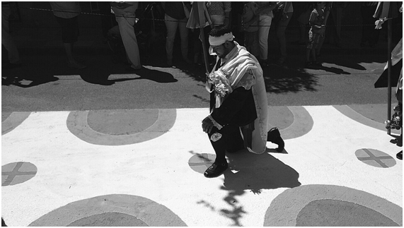 Pecado arrodillado y en silencio en señal de respeto durante una de las paradas que la comitiva realiza en altares domésticos. Foto: Eduardo Santos
